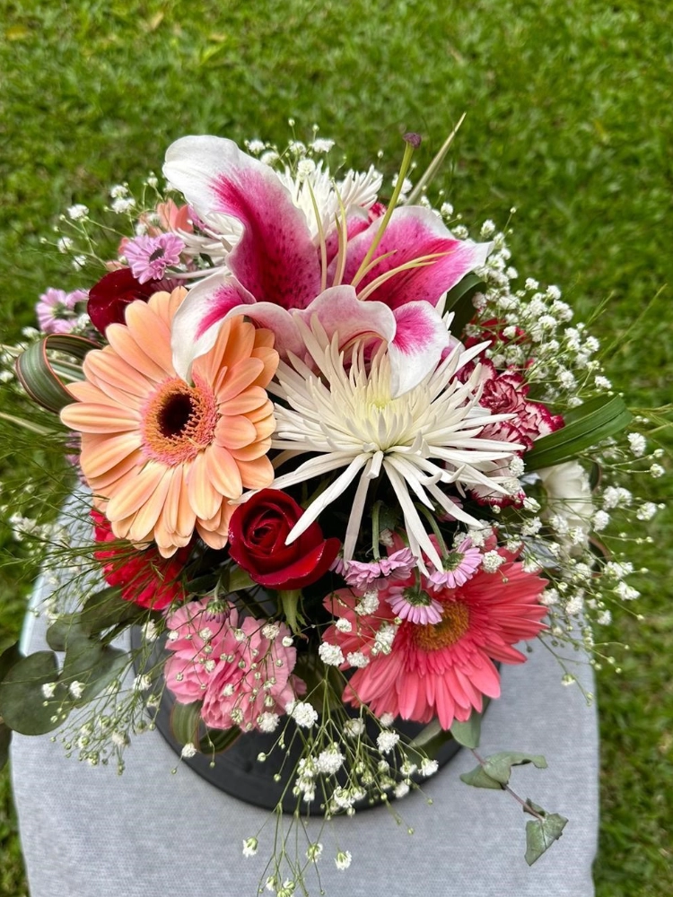 Una combinación armoniosa de flores elegantes en una base de madera natural. Un toque floral perfecto para decorar o regalar.