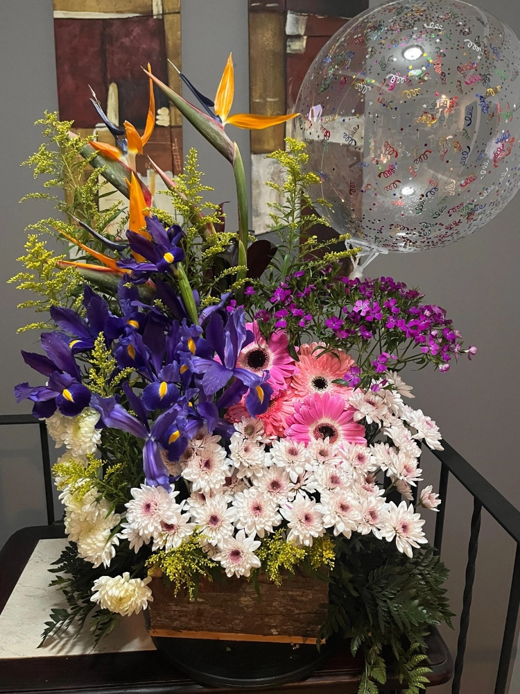 Un regalo completo: flores surtidas, chocolates Ferrero Rocher en cápsula y un globo con decoración interna. Elegancia, dulzura y alegría en un solo detalle.