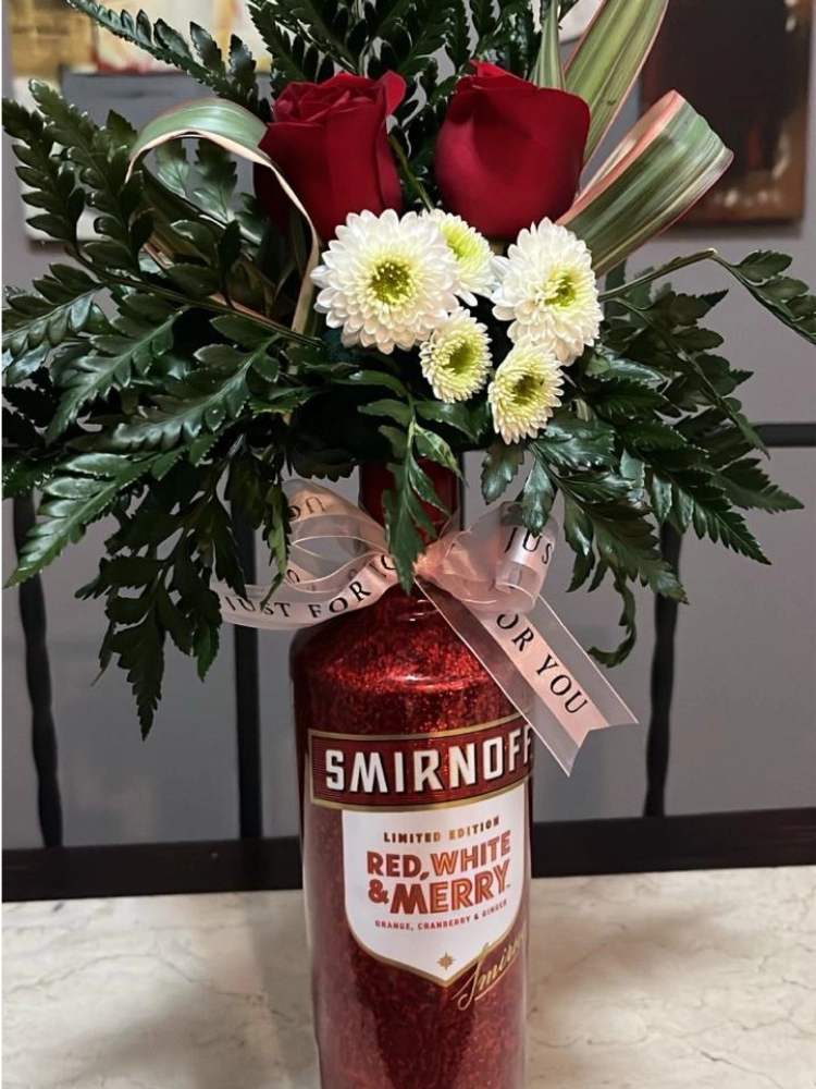 Una expresión doble de amor y aprecio. Esta decoración incluye dos rosas naturales preservadas, elegantemente dispuestas dentro de una botella de licor, acompañadas de detalles decorativos que realzan su belleza. Representa unión, compromiso y armonía, perfecta para parejas o amistades cercanas.