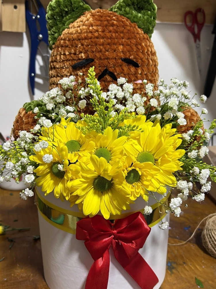 Rosas, lirios, gerberas, margaritas y follaje en una base de madera o plástica. Un detalle vibrante y versátil que se complementa con un globo decorativo ideal para toda ocasión.
