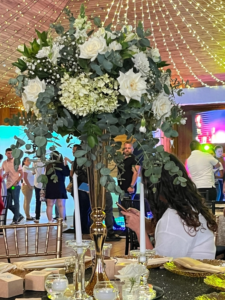 Una pieza central imponente y sofisticada con majestuosas rosas, hortensias frescas y follaje natural. Ideal para vestir mesas principales con un aire romántico y elegante.