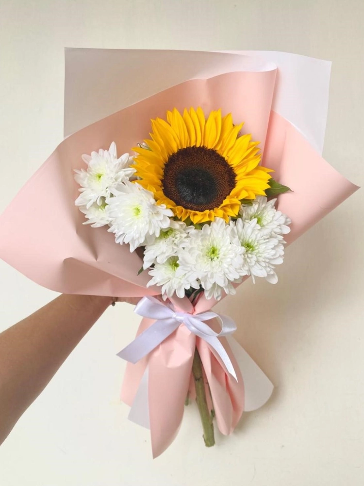Luz y frescura en una sola pieza. Un girasol radiante combinado con margaritas blancas y follaje decorativo. Perfecto para celebrar amistades, logros o simplemente para alegrar el día.