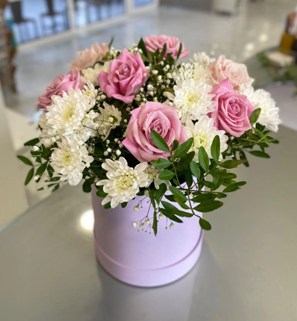 Arreglo floral rosa + margarita en box pequeña