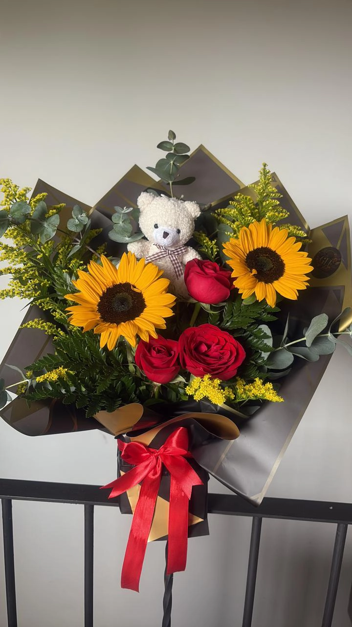 Box con 12 girasoles radiantes, símbolo de alegría y energía, adornado con un lazo que resalta su belleza natural.
